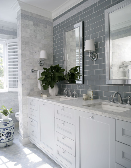 If you want your home to look more expensive, paint your cabinets, perhaps replace your countertops, but definitely replace your faucets, mirrors, and light fixtures. Add cabinet door and drawer hardware that is unique. For extra drama, tile the wall behind your vanity from the countertop to the ceiling (make sure to remove any short backsplash that matches your countertops before tiling).